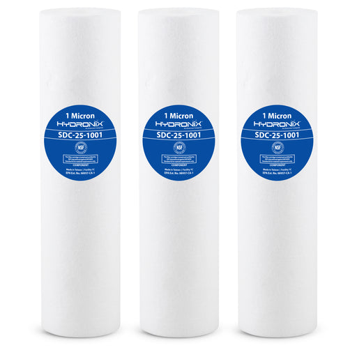 (3 Pack) The Hydronix SDC-25-1001 is a 1-micron polypropylene sediment filter designed for universal compatibility with standard Reverse Osmosis, W...