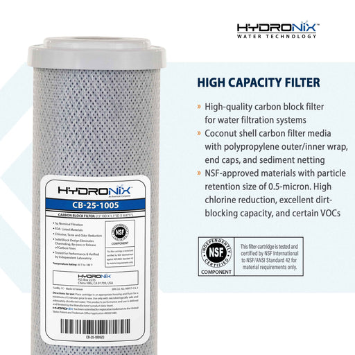 Hydronix SMCB-2510 carbon block filters are NSF/ANSI standard 42 certified for Material and structural Safety. SMCB-2520 filters have a particle re...