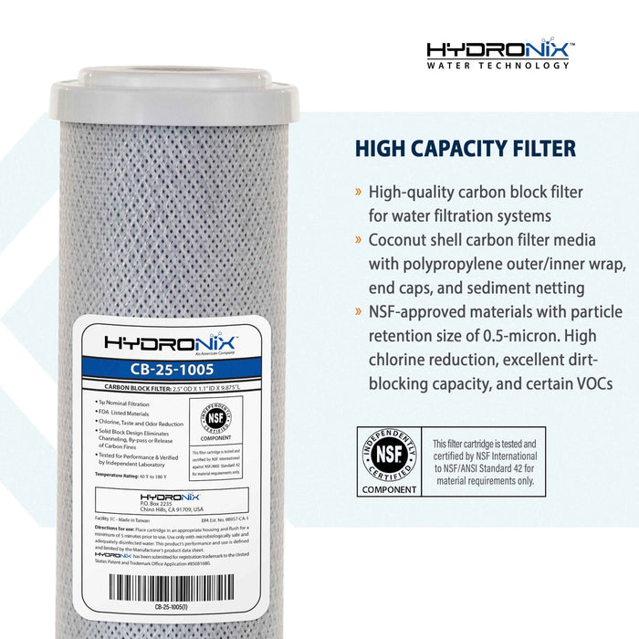 The Hydronix CB-25-1005 is a high-performance carbon block filter designed to improve drinking water's taste, odor, and quality. Made with NSF-certified coconut shell activated carbon, it effectively reduces chlorine, unpleasant odors, and other contaminants, making it ideal for whole-house, reverse osmosis, and drinking water filtration applications.
