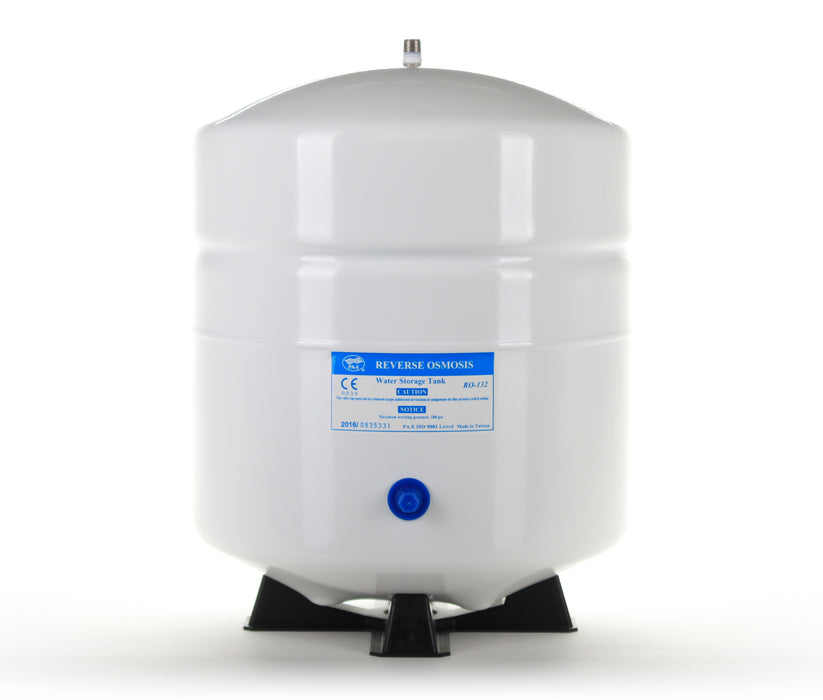 NSF Certified 4.5 Gallon (3.2 Draw-down) Reverse Osmosis Water Storage Tank. Lead, brass and copper are banned for use in purified/drinking water. This tank uses stainless steel connections to avoid lead leaching concerns. This tank is NSF approved under standard 58, and CE approved under the PED (pressure equipment directive). Features - Stainless steel connection - Smooth internal air vent cap prevents diaphragm damaged. - High-grade butyl diaphragm, post-cure procedure insures a tasteless and odorless water chamber - NSF 61 and 58 listed. - IAMPO approved. - CE Mark approved. Specifications & Dimensions - Actual tank size: 4.5 gallons - Tank storage capacity: 3.2 gallons. ** TANK BALL VALVE NOT INCLUDED**