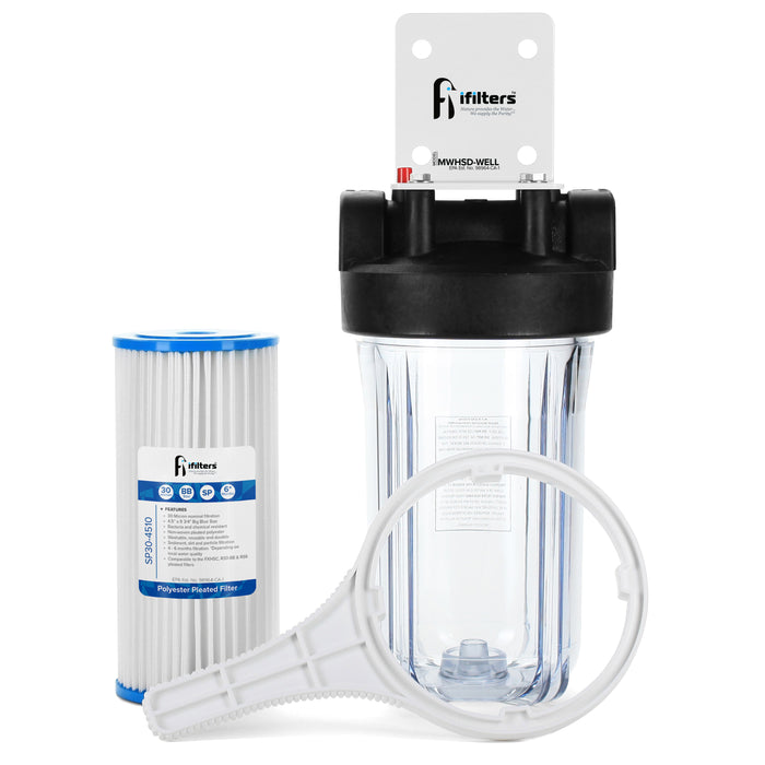 The iFilters MWHSD-WELL 10" Clear Heavy Duty Whole House Well Water Filter System comes complete with a high quality reusable/washable chemical resistant pleated sediment filter and features a high flow housing with 1" Inlet / Outlet Ports.