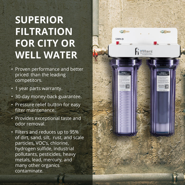 The iFilters LWH-D Gen2 Dual Stage Whole House Water Filter System (Light Whole House Series) has been updated with better filters and added flow for improved reduction and filtration of sediment, dirt, sand, silt, rust, scale particles, chlorine taste, and odor. It has a flow rate of 3 gallons per minute (GPM). This Dual Stage Whole House Water Filter System meets the water demands of many homes and light commercial applications.